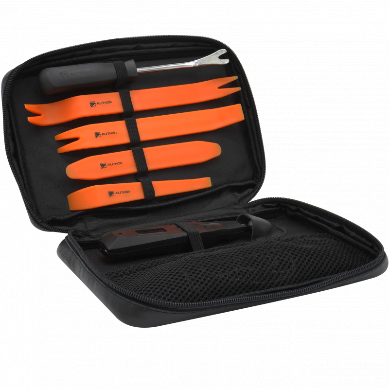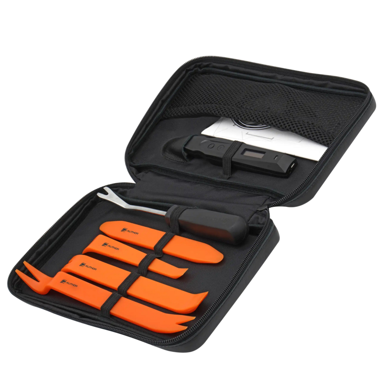 Univerzálny tester elektrických signálov vo vozidlách v sade s nástrojmi na rozoberanie plastových dielov vo vozidlách v ochrannom obale. Meranie napätia, detekcia digitálnych signálov CAN, LIN, K-line ..., osciloskop, generátor signálu. OLED displej, nabíjateľná batéria.